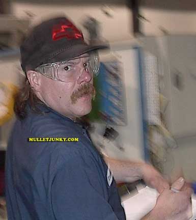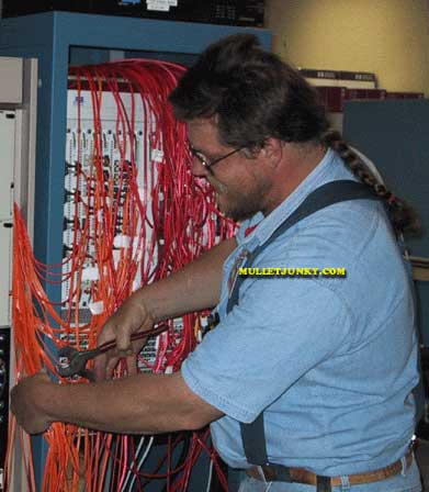 Once again we see a rare example of a mullet breaking away from the dumb, beer drinking, racist stereotypes by entering a pseudo professional field. Sam, most likely started out as a Trade school Mullet(see pic fix 2) and has now, finally achieved that high teck job he always wanted. * On-the-job transcribed audio recording: "hold it...let me just...cut....THAT orange wire....there...fixed. |