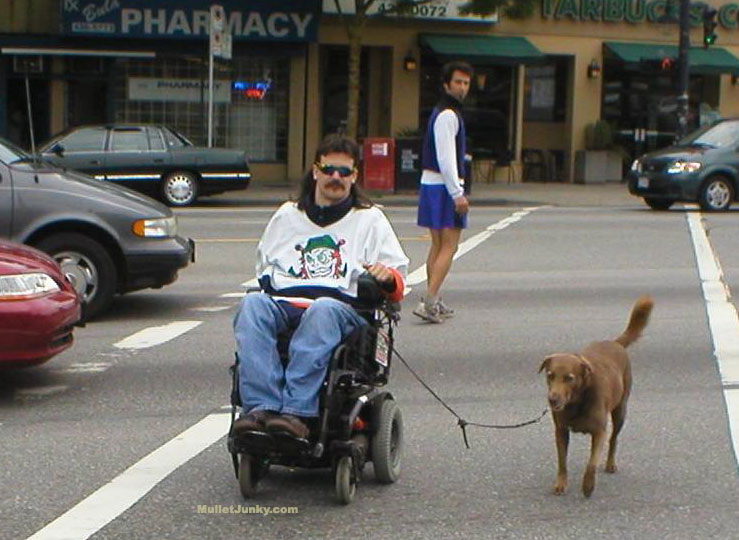 Looks just like a Classic Mullet right? Sweet mullet, Mustache, cheesy yet strangely intimidating sunglasses, etc. The picture below will give you an insight into the true uniqueness of this specimen. Starting with the dog, blindly pulled by a leash attached to a wheelchair. Driving the wheelchair is a Classic Mullet with an image of a joker on his chest. As you can see the mulletude continues to exist even though he is severely immobilized(possible right arm missing). |