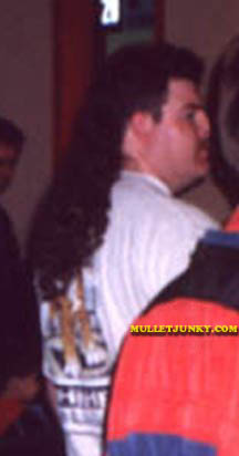 From the days when Quicksilver, Gotcha and SideOut-sport/surf/volleyball wear dominated the malls and the streets; this fashion czar surfarces. The hard plastic visor adds that little "extra something" that compliments the moussed Permullet. In turn this apedrapes nicely over the "subtle" neon pink collar. Often times the ability to accessorize escapes the mulleted, but not our carefully manicured ladykiller. |