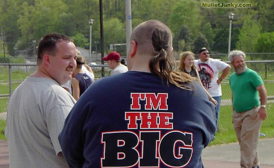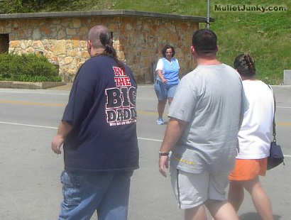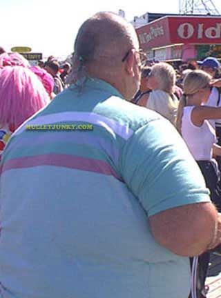 The Skullet is a strange creature. The reason for intentionally shaving the head completely bald, but leaving the mullet (flap-for-flair) still has the power to bewilder even the most seasoned mullethunter. Sometimes, a slight visual association between skullets and radical religious groups (such as Hare Krishnas) are made, but don't be fooled. This theory has been proven wrong with 92% of the skullets studied. Also, as far as we know, there is NO definite correlation between obesity and skullets. It is NOT a common trend within the skullet subspecies. The overweight factor in this case is purely bonus. * The tight shirt fighting-against-gravity combo gives the Overweight Skullet's arm a distorted tumor-like look near the upper elbow. |